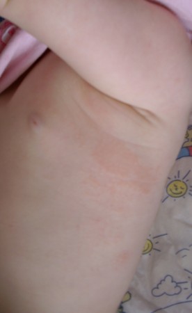 Прочитала про крапивницу....нет у нас таких симптомов. Ни зуда, ни жжения, она не ввиде волдырей...Просто покраснение кожи.....