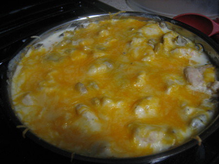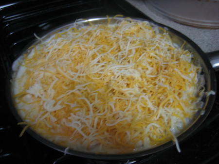 потом все это раскладывается по кокотницам в оригинале, но у нас их нет, но есть соуспен ( глубокая алюминиевая сквородка) и все туда выливаю и сверху посыпаю сыром. и в духовку на 10-12 минут при 350 градусах