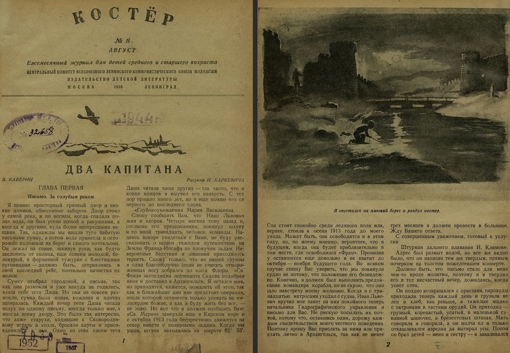 Первая публикация знаменитого романа Вениамина Каверина "Два капитана" состоялась в журнале "Костёр" за 1938 год.