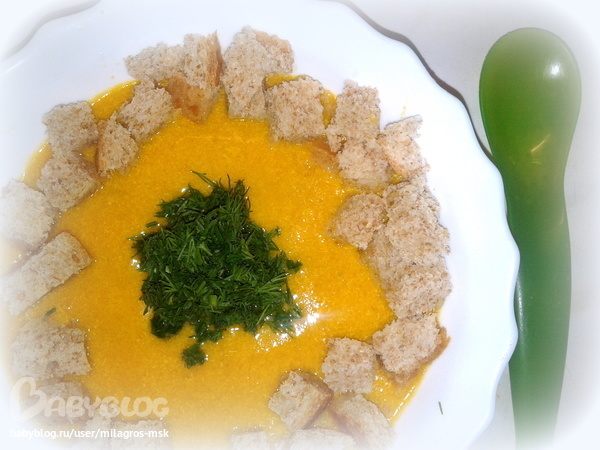 Это наш один из самых любимых супчиков. Только сегодня ели, добавляю морковку и вместо  сливок ( нам еще рано) добавляю молочко агуша, да и еще кусочек масла сливочного и посыпаю укропчиком. Вкусняшка, сама его ем