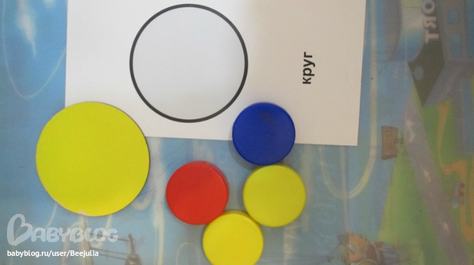Далее у меня было запланированно поговорить про четырехугольники и квадрат в частности. И беседа моя начиналась с того, что я дала геометрическую линейку- трафарет. Хотела чтобы он через нее рисовал квадрат, но Степка сказал, что будет рисовать круг. Я решила не спорить и поддержать его желание и поговорить про кргуг. Достала круги из блоков Дьенеша, пособие к ним и из пособия "Математика с пеленок" карточку с изображением круга. И заодно обсудили что круглое есть в природе. Надо будет в следующий раз подготовить карточки с изображением солнца, ябоока, мяча, колеса и прочее, чтобы он нагляднее все это увидел и сделать какую-нибудь апликацию. Но в этот раз я не была готова.