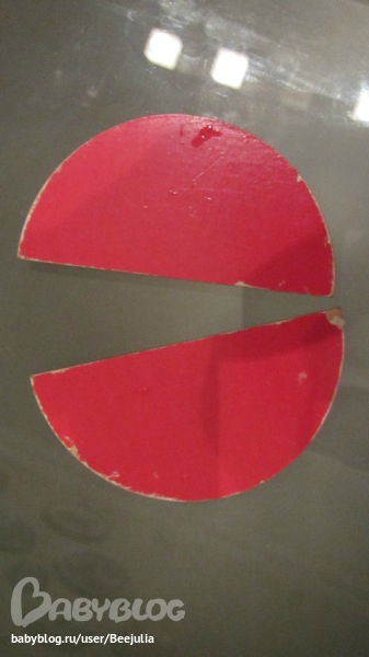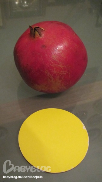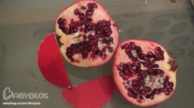 Раз уже говорим про кргу, то Спонтанно родилась идея поговорить тогда и о целом и части. Достала Дроби Никитина. Посомтрели, подержали в руках целый круг и его половинку, подумала хорошо бы поделить яблоко для наглядности, но яблока не оказалось, делили гранат.