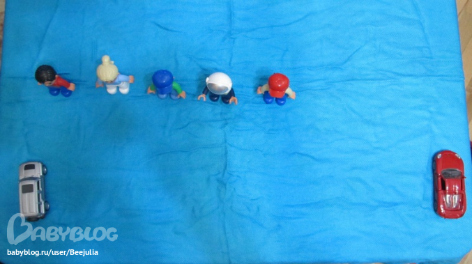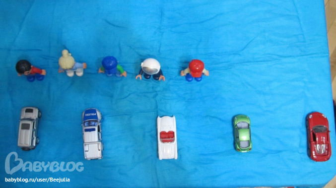 1) 10 маленьких предметов, в зависимости от пристрастий вашего ребенка. Для своего автолюбителя я взяла 5 маленьких машинок и 5 человесков из Лего. Количество вы тоже можете варировать так как вам удобнее и в зависимости от знаний ребенка. В книге автор берет 8 пуговиц и 8 монет.