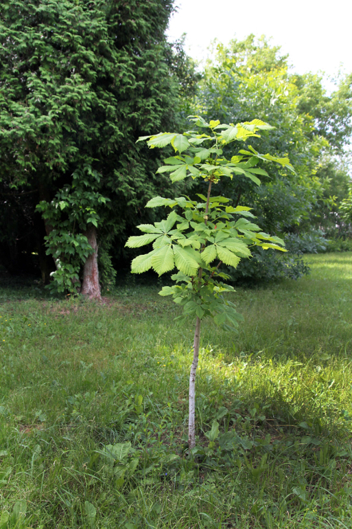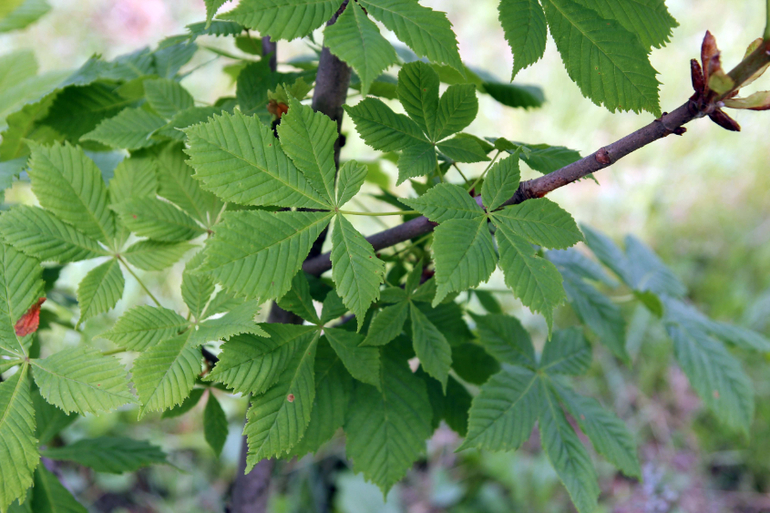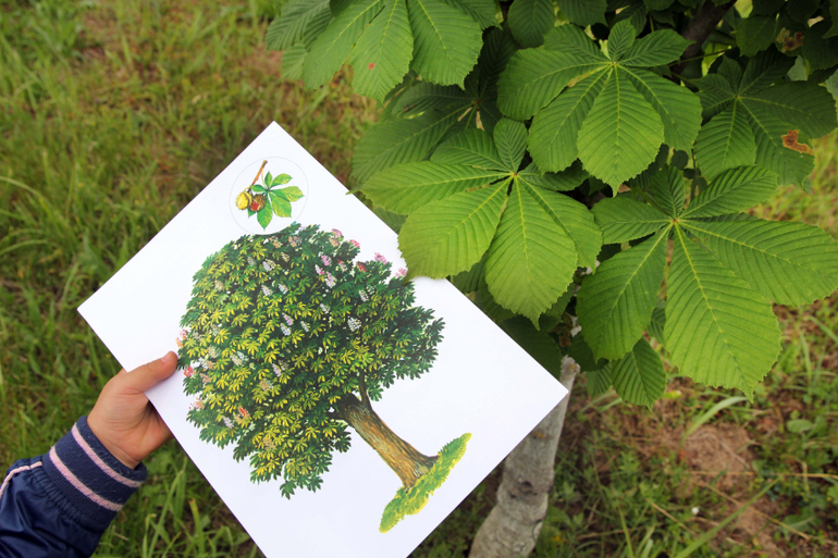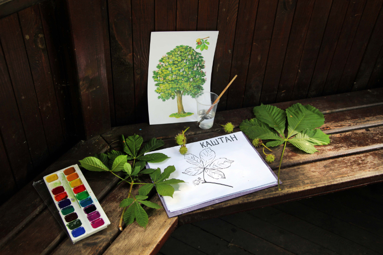 Нарисовала лист каштана, его плод и затем раскрасили)