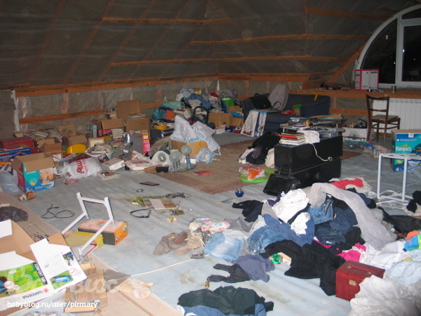 На мансарду мы стаскивали вещи по ходу взросления детей. В это же время освобождались шкафы и полки на первом этаже. Теперь на первом этаже почти нет лишних вещей и вещей, которые могут попортить дети. Они все сложены в кучи на мансарде.