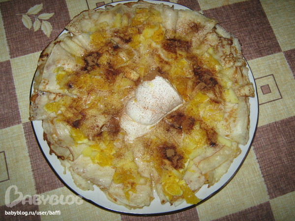 берем 1 яблоко,1 апельсин,режем кубиками,обжариваем в сливочном масле,выкладываем на блины