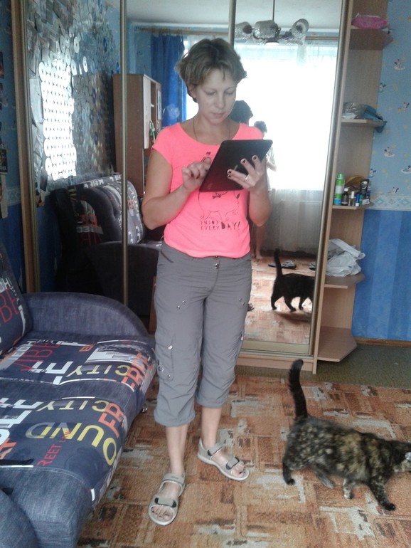 Вто такая я сегодня в 9 утра. Сфотографировала себя на планшет, стою фотку выбираю, в это время доча меня сфоткала и я выбрала её работу))) На футболке позитивная надпись