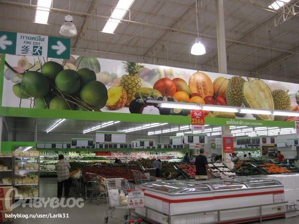 ШоппингОчень хороший супермаркет! Фрукты и овощи - дешевле и выбор огромный, всегда все свежее. Мне показался смесью Ашана и Метро (Москва), но для покупки не нужны специальные карты, расчитан на мелких оптовиков. Люблю покупать там семгу свежую и мороженную - от 240 бат/кг, наборы для суши - заготовки из креветок, осьминога, тунца, кальмара. Для гурмана там всегда можно преобрети свежих лягушек, замороженных черепах, и даже личинок))) Достаточно много импортных продуктов - ягод, макаронных изделий, кофе, соусов, консерв. И, внимание, тут продается лучший и самый настоящий майонез Real - специально за ним туда ездим(фото выставлю позже)!!