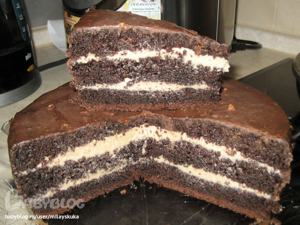 Прослоила коржи кремом из:сгущёнка(150гр)+масло слив(150гр)+ванилин+1ст.л. какао