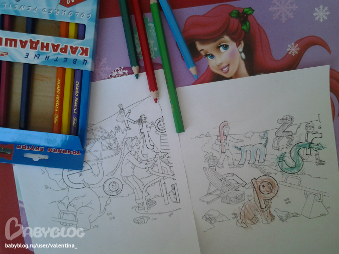 Это одно из наших занятий буквами. Я бы сказала диктант, я называю букву и цвет, а Соня раскрашивает, споткнулась только на букве m.