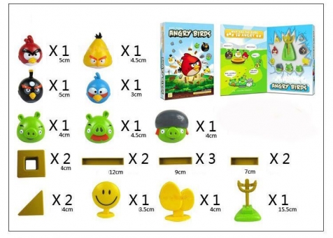 В игру входит 3 Сердитые Птицы, 4 зеленых свиньи, одна пусковая установка в виде рогатки, элементы конструкции разной формы и карты с изображением постройки и баллами.