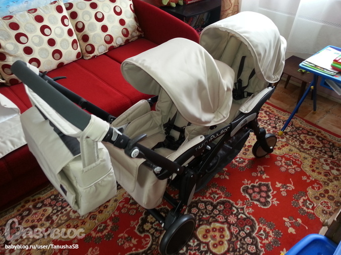 Коляска укомплектована дождевиками (индивидуальными для каждого сиденья) и замечательной,вместительной сумкой!!!На фото к сожалению ее плохо видно,позже добавлю отдельные фотографии.Мы много где с девчонками ходим и без сумки нам было бы тяжеловато.А тут такой шикарный экземпляр в комплекте.