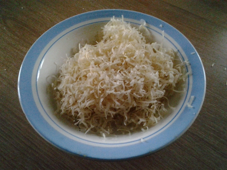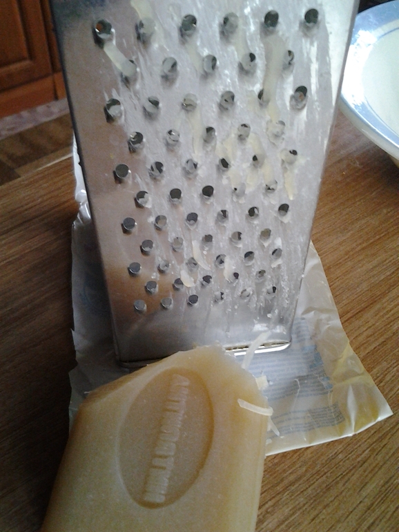 далее мы натираем его на мелкой терке, мыло должно быть только что из упаковки, если вы возьмете недавно открытое мыло рискуете надышаться мыльной пылью...ну или мыльной крошкой...