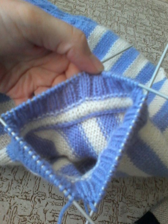 3. Самое интересное-убавления и прибавления. Вязание поделила ровно пополам. 76 петель оставила на спицах, а остальные 76 пошли в работу.Делала точь-в- точь как ЗДЕСЬ описано, т.е. написано закрыть 2 петли, значит закрыла 2;только расстояние между рядами с убавлениями и с прибавлениями рассчитывала сама. Т.е. после всех убавлений вязала прямо до необходимого размера исходя из толщины ножки ребенка.
