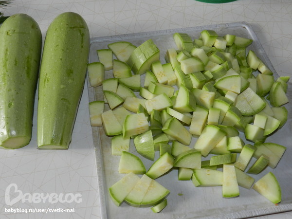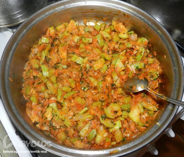 Далее жарим кабачки вместе с морковью и луком, потом добавляем пару ложек томатной пасты, солим, перчим, а в конце бросаем чеснок и укроп)