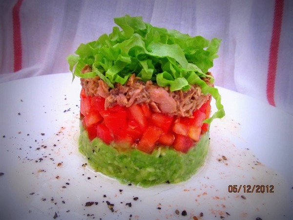 Можно сделать его не послойным, а в общем блюде, тогда авокадо нарезать кубиком, так же заправить и тунец поломать крупнее, чтобы все кусочки салата были одинакового размера, присолить, оливковое масло, лимонный сок ( всего по чуть):)