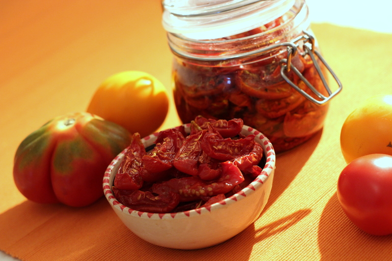 Готовила так: вымыла-обсушила, разрезала на дольки (на фото- 6 долек в помидоре сливка, если резать тоньше, то получаются в итоге просто сушеные-сушеные, можно, пожалуй, такие при выпекании хлеба добавлять). Выкладываю на пергаментную бумагу, смазанную маслом. Дольки сбрызгиваю маслом, посыпаю солью, травами, сушеным укропом. В духовку, предварительно разогретую до 100 градусов, часа на 4. Как готовы, складываю в банку, заливаю маслом, чеснок выдавила, под крышку в холодильник.