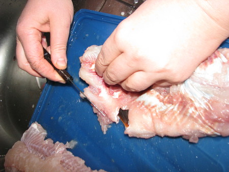 Шлепать надо от души, при этом размягчается подхожный слой мяса и отделяется от шкуры. Но как бы ни хлопали, останутся места, которым этого мало, придется подрезать ножом (удобнее маленьким): в месте соединения обоих филе и кожи - вдоль полосы по спинке,
