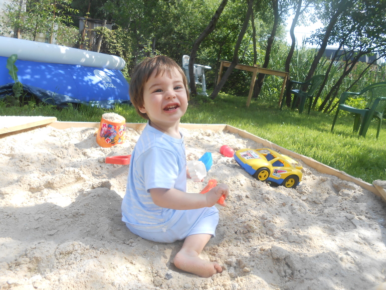 Вот тут я даю Ленечке полную самостоятельность во время еды, он учится есть ложечкой. Вынула после еды из стульчика, отряхнула, в песочницу посадила)