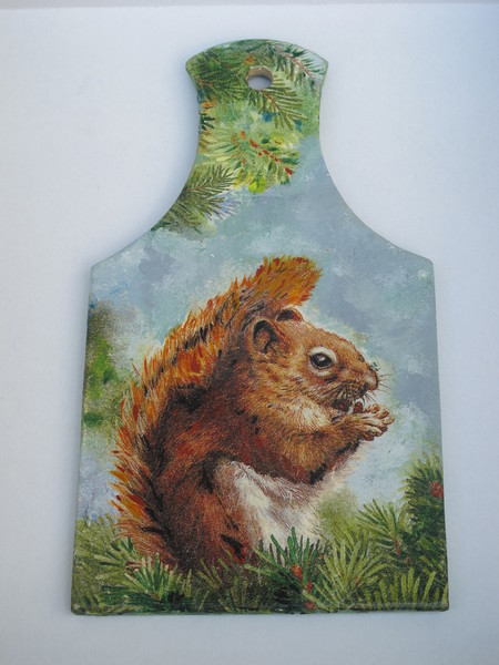 3) Наклеила основной мотив методом файла - сама белочка наклеилась хорошо, а вот в еловых лапах в нескольких местах салфетка порвалась и были сккладочки