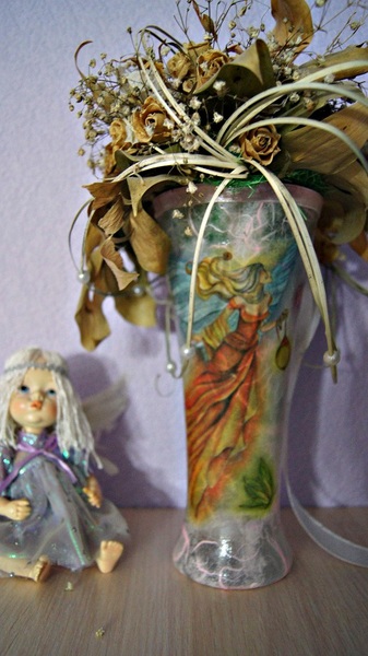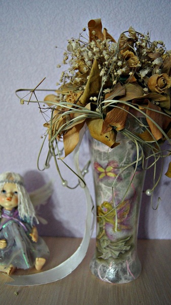 Ход работы: Вазу обезжирила, сыну дала кусок св. розовой рисовой бумаги, он мне как следует ее разорвал. Принялась клеить все ПВА, после просушки пошкирила и на ПВА приклеила мотивы. Покрыла 5 слоями лака. На край приклеила ленту. Теперь вот такая вазочка держитмой свадебный букет.
