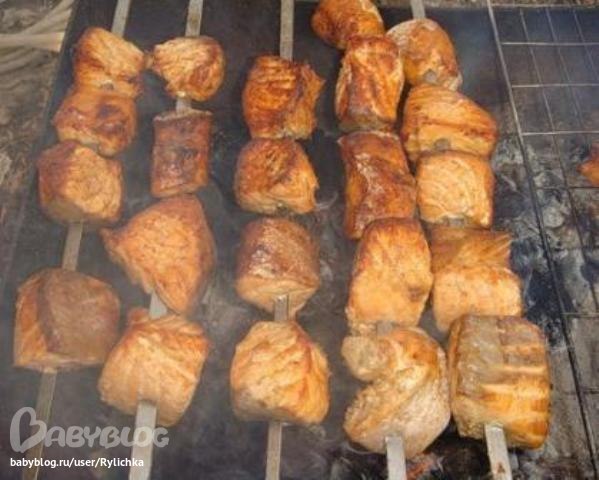 Рецепты диеты:)Семгу (1кг) нарезать кусочками 5*5*5см, слегка посолить, поперчить по вкусу, добваить лимонный сок и цедру одного лимона, выдержать на холоде 2-3 часа. Зажарить, нанизав кусрчки рыбы на шампуры. Подавать с зелеными салатами.