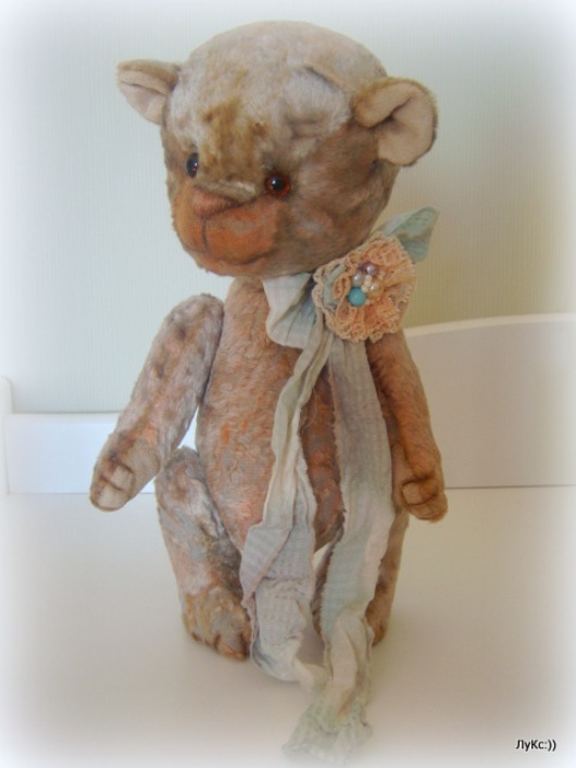 Привет! Исправляюсь!!! Проше уже два месяца, а мне все некогда его показать вам.... ух... винтажный плюш (была цветастая скатерка....которую я оооочень долго-долго-долго отбеливала, потом проклеила дублерином), опилочки, стеклянные глазки, тонирован маслом, вставки ушек и ступни из фетра, ленту делала собственноручно — обжигая ткань со всех сторон... вот какой хороший вышел: