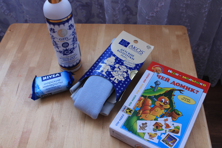 Подарочки для меня и маленького сыночка. Классный шампунь, мыло(для старших мужчин), колготочки и игра для малышочка.