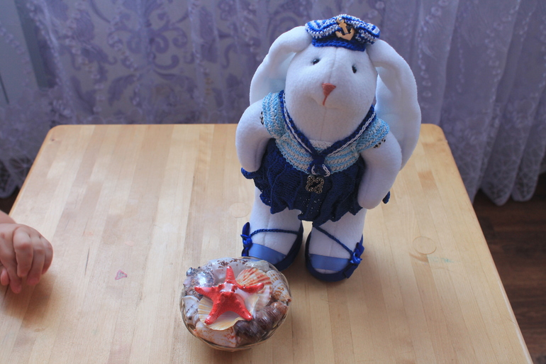Зайчик. Рядом ракушки и ручонка которая пытается все стащить.