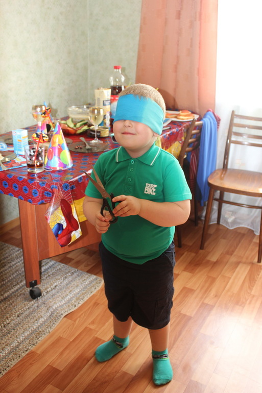 Для всех, в том числе и для взрослых на веревочку были привязаны небольшие призы и каждый по очереди с завязанными глазами должен был отрезать этот приз. Естественно именинник был первым...