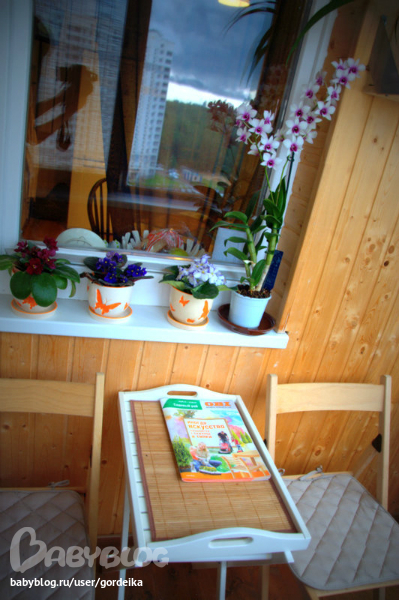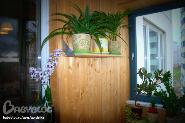 Балкон. Просто обшили вагонкой, но в этом году решили все-таки менять окна, а то моя мини- оранжерея зимой задубеет)))
