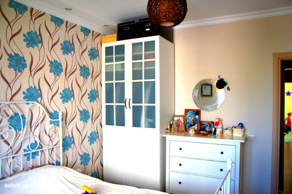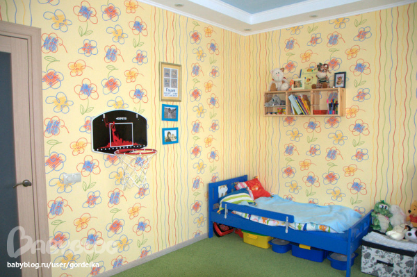 детская. Пока стоит только кровать и комод (он у окна), не стала фотать остальные стены - там у нас машинки кучой сложены)). Окно напротив двери.