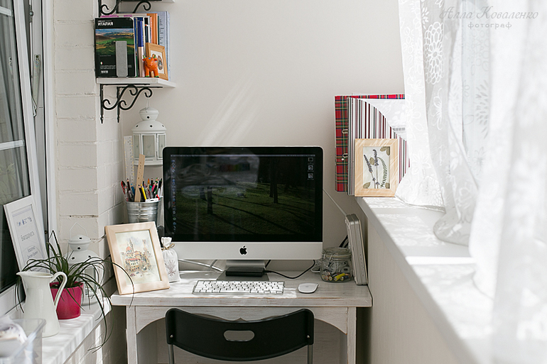 Мне нравится проводить время на этой лоджии. В дневной сон ребенка и вечером, когда он уснет, я работаю здесь за Маком. По утрам - глажу или вешаю свежепостиранное белье, пока сын развлекается сравнением зверюшек на картинках, запутывает ленты или потрошит ящики комода. А потом мы вместе разглядываем проезжающие автомобили и спешащих по своим делам пешеходов.