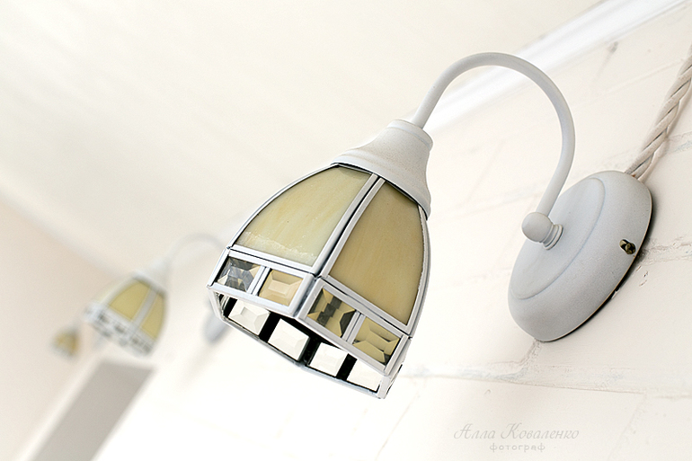 Свет для этого помещения я выбирала долго. Красивых белых бра по приемлемой цене мне не попадалось, в итоге взяла окрашенные под бронзу, баллончик белой краски по металлу и лак. Пара ночей заклеивания стекол малярным скотчем - и вуаля, можно вешать белые светильники.