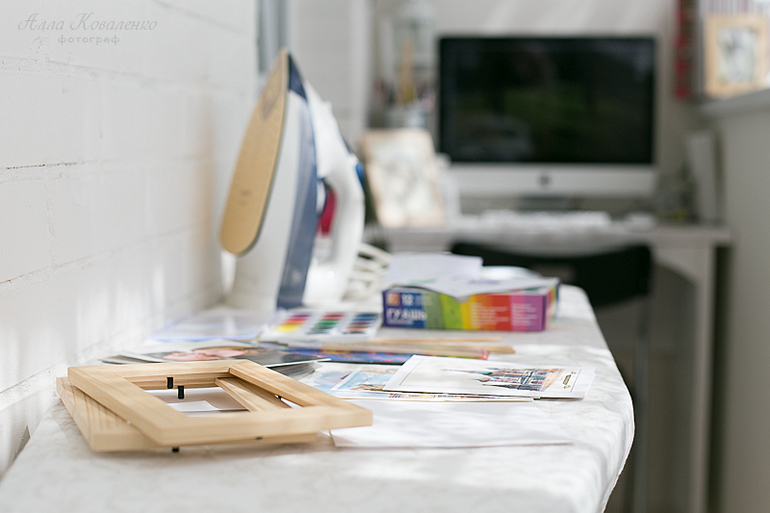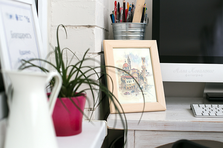 Здесь у меня для вдохновения стоит акварелька флорентийского собора, гербарий из Прованса, два ведра разнообразных творческих инструментов, полка с путеводителями, банка для сбора разряженных батареек (после наполнения банки мы относим их на утилизацию) и любимый Мак. Здесь же папки со счетами за коммуналку и прочая семейная отчетность. А в уголке притаился льняной мешочек с лавандой. Когда на улице серость и сырость, достаточно взять его в руки и слегка размять пальцами - в тот же момент все вокруг окутает сиреневый туман лавандовых полей Прованса. Освежает взгляд и мысли, отвлекает от пасмурной погоды за окном - маленькое чудо. Здесь мешочек уже умыкнули чьи-то маленькие ручки:)