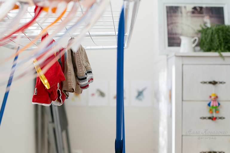 Также у нас на лоджии стоит сушилка для белья (с импровизированным детским аттракционом "дождик из лент") и гладильная доска (по совместительству - стол для творчества). А еще хранится стремянка и запасной складной стул из Ikea.