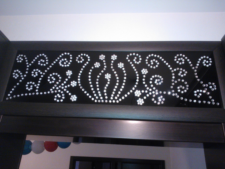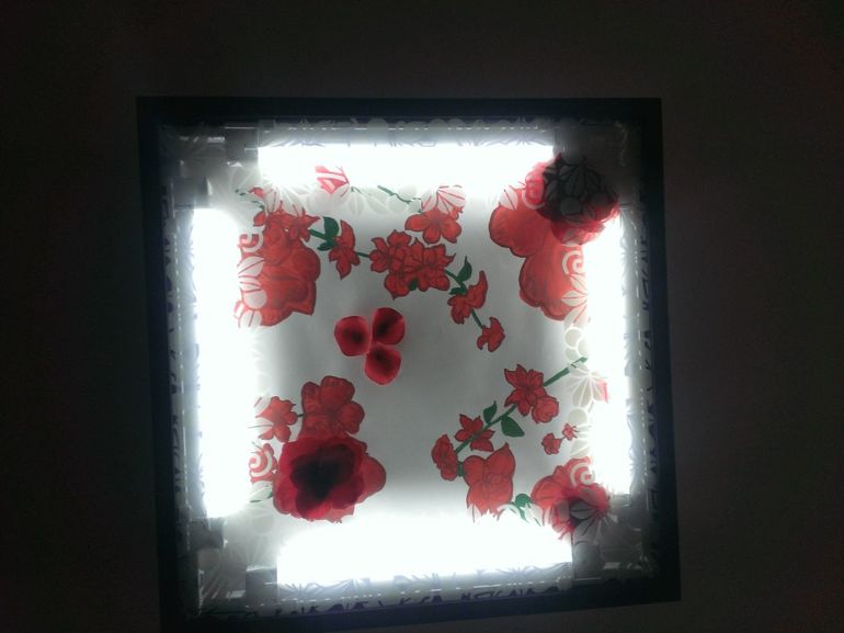 Я ее (люстру) придумала, купила все детали необходимые, нанесла на стекло орнамент, чтобы не видно было ламп. Дочь нарисовала на бумаге карандашный эскиз, а я разукрасила и наляпала 3Д-эффект ))) Ну а муж отвечал за техническую часть - приладил лампы, повесил. Висит, радует глаз ))