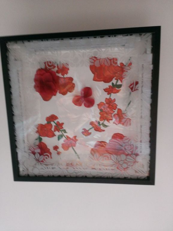 А вот это... не знаю, как и назвать... Захотелось мне чего-то этакого... Вот, решила украсить коридор. Это, пусть будет панно, висит прямо напротив входной двери в коридоре. Я вычитала, что фен-шуй советует в коридоре вешать картины разные... Ну, вот... этот мотивчик и есть вариация насоветованного фен-шуем.... Типа, там полная чаша, 5 цветочков, - это мы все пятеро в полной... чаше... да...