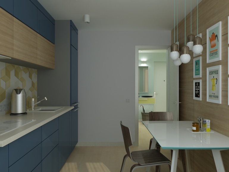 а где же посудомойка? цветовая гамма очень понравилась, особенно в прихожей. А не подскажете, что за светильники над столом?
