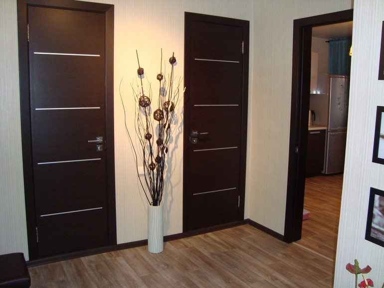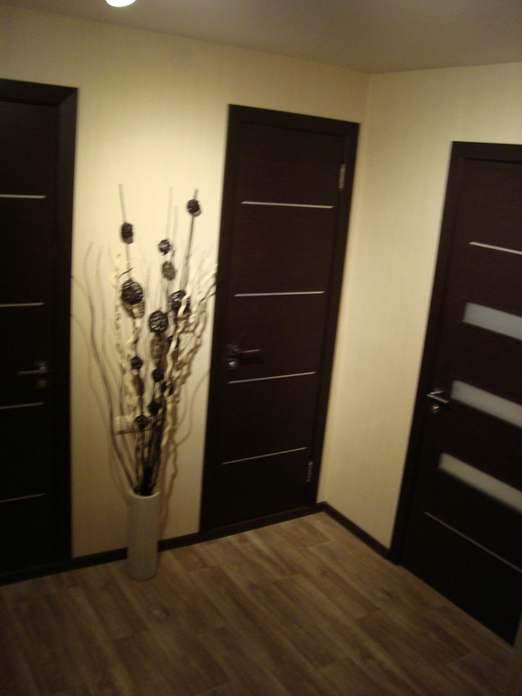 Вид на кухонную дверь и санузлы (двери без стекол) от входной двери.