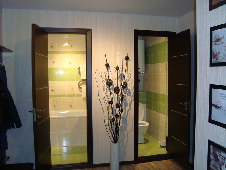 Мы случайно выбрали эту плитку — подошла по цене, но, на мой взгляд, она не очень яркая, тем более, что основной цвет белый — очень уравновешивает смелость зеленого. Двери местного производителя "Сибпрофиль", цвет венге.