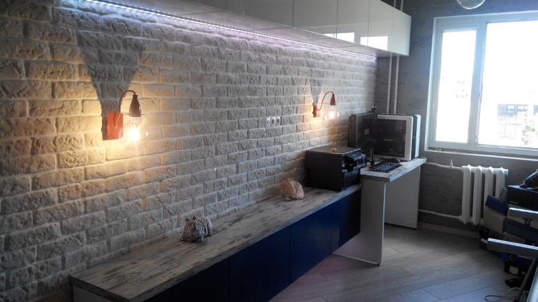 На этой стенке 10 шкафчиков, 4 внизу, 6 вверху. Полка для телика (можно и посидеть) и для принтера. Ну и для всяких милых безделух :) И мой рабочий стол. Ладно, наш, с ребенком :) Письменный у него будет отдельный, растущий.