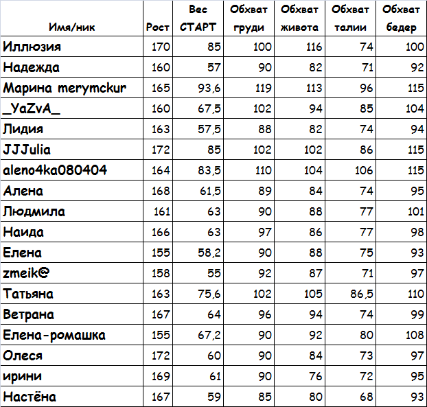 Стройнеем вместе(здесь пишем марафоны,которые уже идут, или предложения о марафоне)Иллюзия позвала желающих, и вот с сегодняшнего дня мы начинаем :)