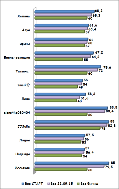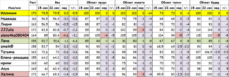 Алена! Вот кто сегодня наш герой и пример - не знаю, что она делала эту неделю, но результаты замечательные! Вес -4,6кг! Ален, но будь осторожнее - если это лишняя жидкость и отеки - хорошо. Голодом морить себя нельзя категорически. Наша цель не быстрый, а надежный результат! Объемы у Аленки естественно стремятся вниз :)