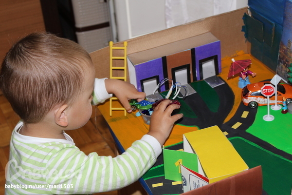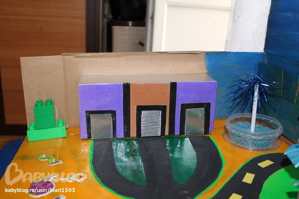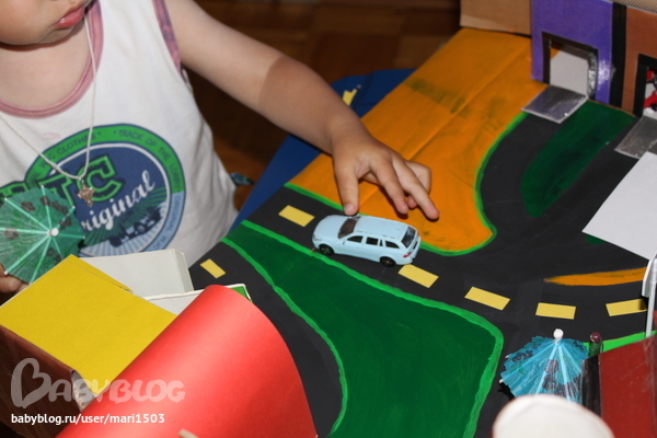 Дорога, заканчивается аркой, арка - отрезанная часть стаканчика из-под ватных палочек. Планируется продолжить и соорудить тунель из рулонов, оставшихся от бумажных полотенец.