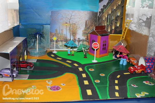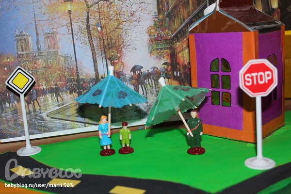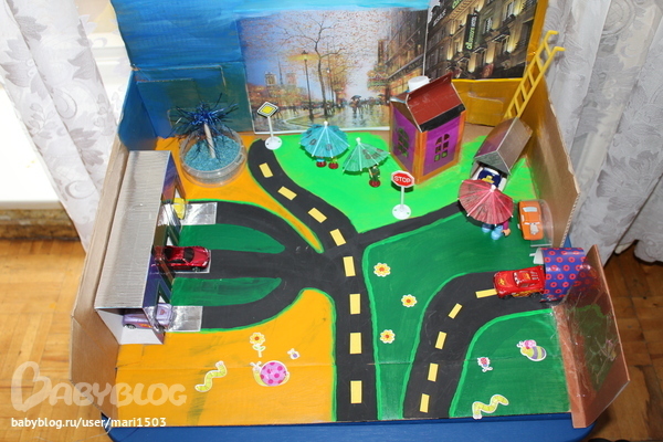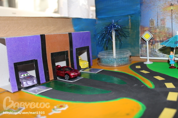Сгущающиеся сумерки, включенные фонари - один из осенних французских вечеров, где прохожие неторопливо прогуливаются, беседуют (можно поразмышлять о чем они говорят), складывается ощущение уюта, мира и тепла. Но это мы уже по прошествии нескольких дней ощутили и узнали, что здесь располагается отель «La Tour Notre Dame», а так дорога задумывалась самая обычная. Основную дорогу начала рисовать я, потом подключился Ваня, взял кисточку и с удовольствием помогал. Задал направление трем дорожкам, четвертой, которая ведет направо в арку и пятой, ведет в гараж. А я уже оформляла границы. Еще Ванюшка сам клеил насекомых и цветочки, а остальное делала я, теперь вот задумалась, что в приципе много можно было сделать совместно. Может тогда не стал бы пытаться отодрать гаражи от основы, на которую они приклеены.