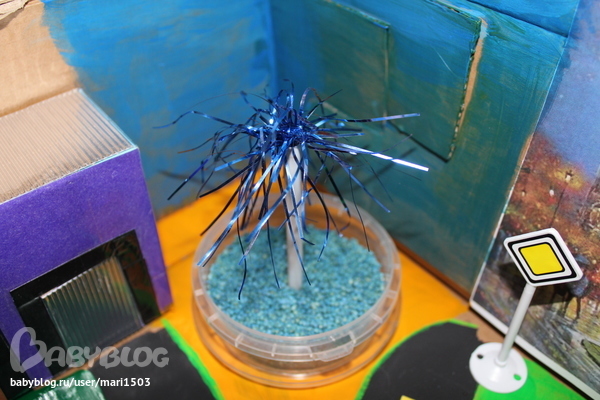 Фонтан (крашенное пшено, половинка трубочки от коктейля всавлена в проделанную дырочку в контейнере от соуса, вверху мишура), уже второй по счету, т.к. Ване он особоенно приглянулся, а первый не выдержал натиска маленьких ручонок:))