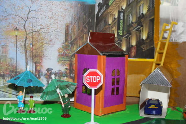 Идет дождь, и конечно каждому нужен свой зонтик. Домик из коробки из-под кефира, в его окнах постаралась сделать эффект включенного света и маленький гараж с крышей из гофрированного картона.