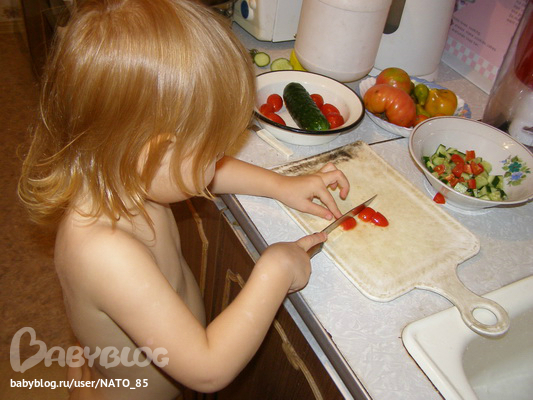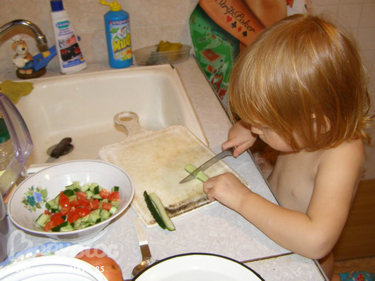 А еще Лизик с удовольствием делала нам салатик из огурцов и помидоров
