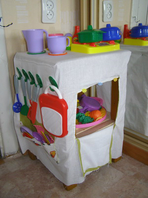 Для удобства игры и хранения посуды и еды я быстренько сделала подобие плитки с духовкой (она же хранилище инвентаря!). Если раньше все хранилось в коробке и постоянно валялось как придется, то теперь все компактно разместилось на неиспользуемом стуле и после игр вещи спокойно занимают свои места.